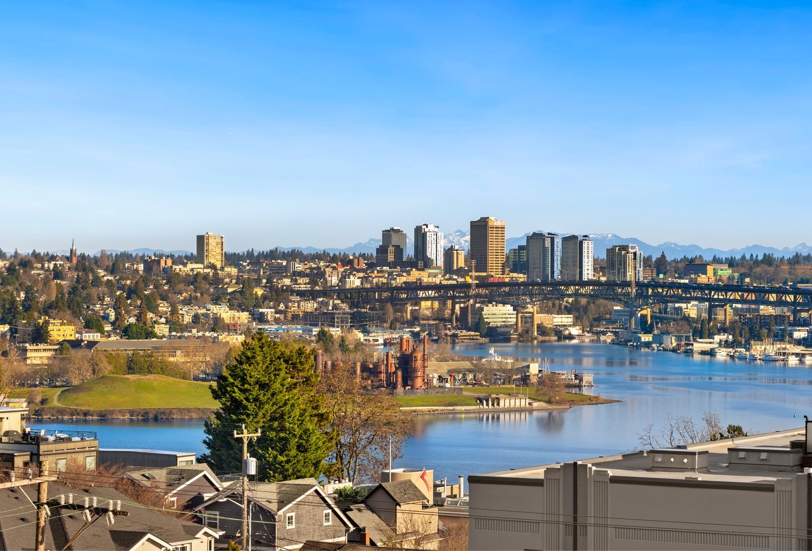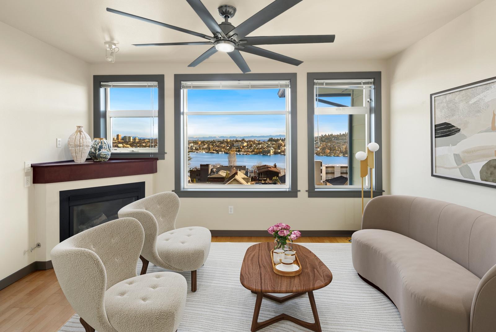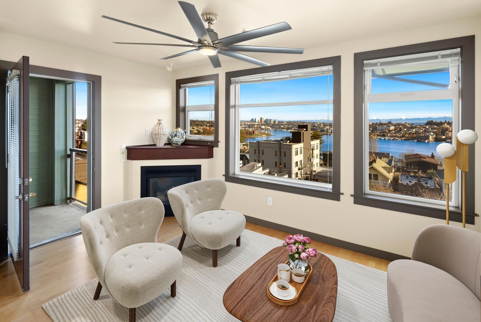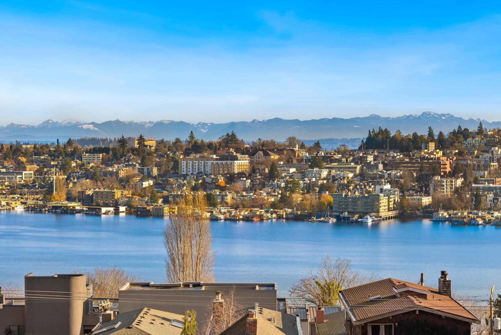 This is it! Lake views in a walker’s paradise. Enjoy views of the water from every room in this one-bed, one bath condo with great space for everything. A spacious kitchen greets you upon entry and then flow into the living room to cozy up to the gas-fireplace while you watch the float planes take off. In summer, step onto your private deck to take in the sail boats. A large bedroom with multiple closets makes this a perfect sanctuary in the city. Just a 10-15 minute walk from Meta, Google and Amazon or hop the bus or bike lane. Perched high in the secure building, clear days will have unbeatable views of the Cascades and Rainier from the rooftop deck. Dedicated parking spot in a prime location and storage closet just down the hall. With no rental cap, this is also an ideal pied-a-terre or investment property in this well-managed building!