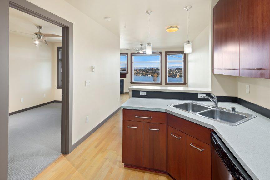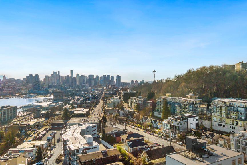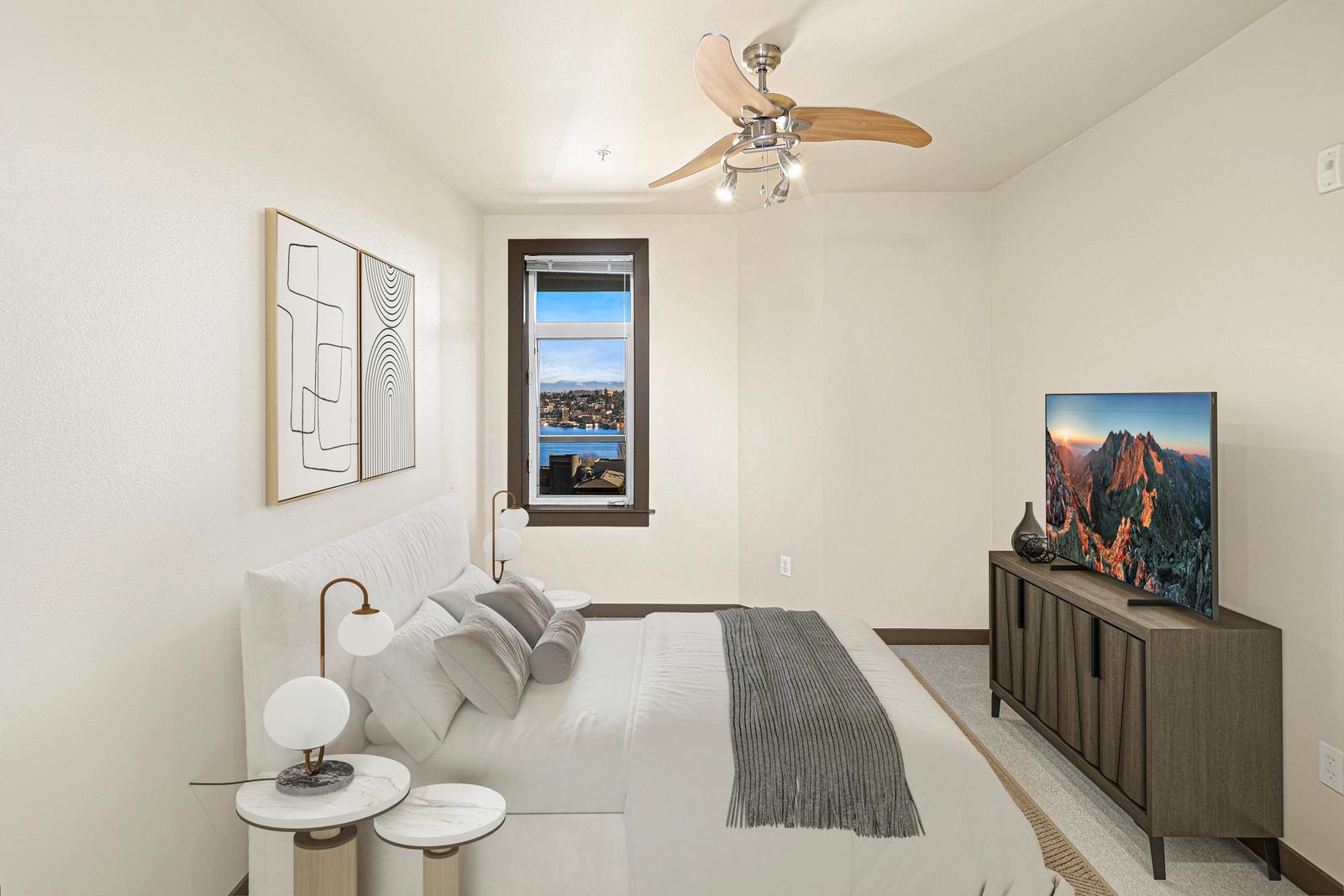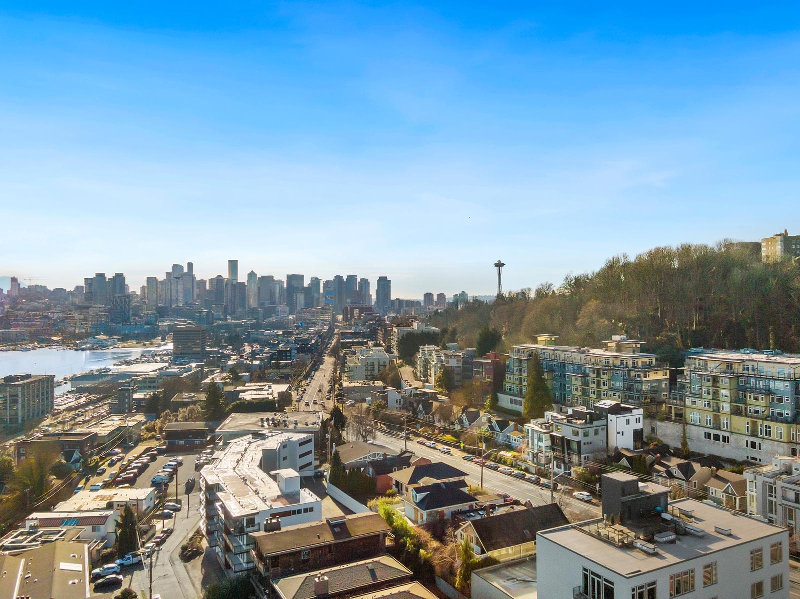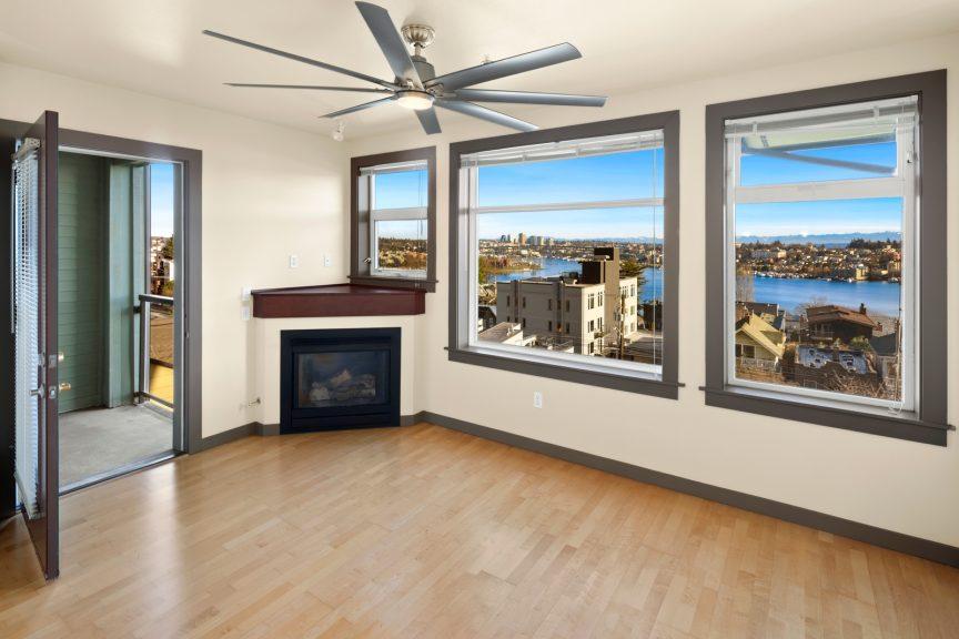 This is it! Lake views in a walker’s paradise. Enjoy views of the water from every room in this one-bed, one bath condo with great space for everything. A spacious kitchen greets you upon entry and then flow into the living room to cozy up to the gas-fireplace while you watch the float planes take off. In summer, step onto your private deck to take in the sail boats. A large bedroom with multiple closets makes this a perfect sanctuary in the city. Just a 10-15 minute walk from Meta, Google and Amazon or hop the bus or bike lane. Perched high in the secure building, clear days will have unbeatable views of the Cascades and Rainier from the rooftop deck. Dedicated parking spot in a prime location and storage closet just down the hall. With no rental cap, this is also an ideal pied-a-terre or investment property in this well-managed building!
