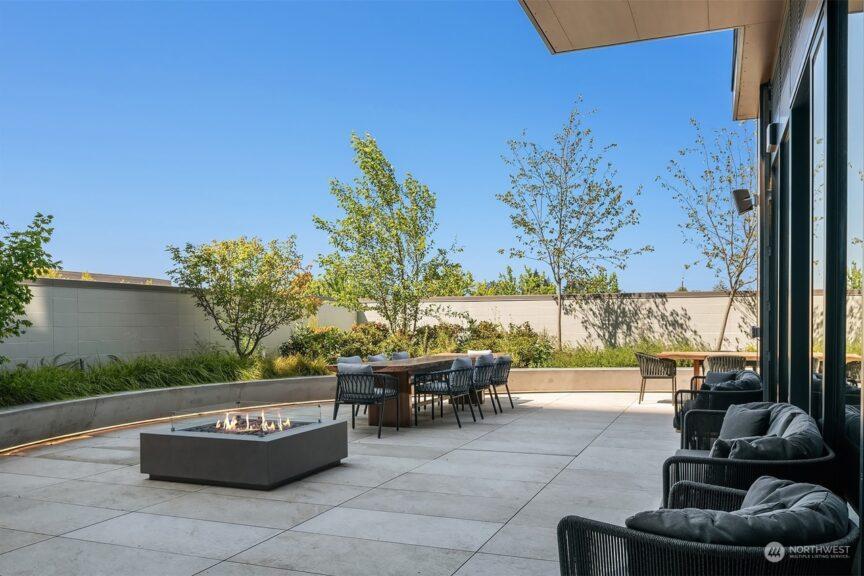 Outdoor Terrace: Featuring lush landscaping, grills, and a fire table for outdoor gatherings.