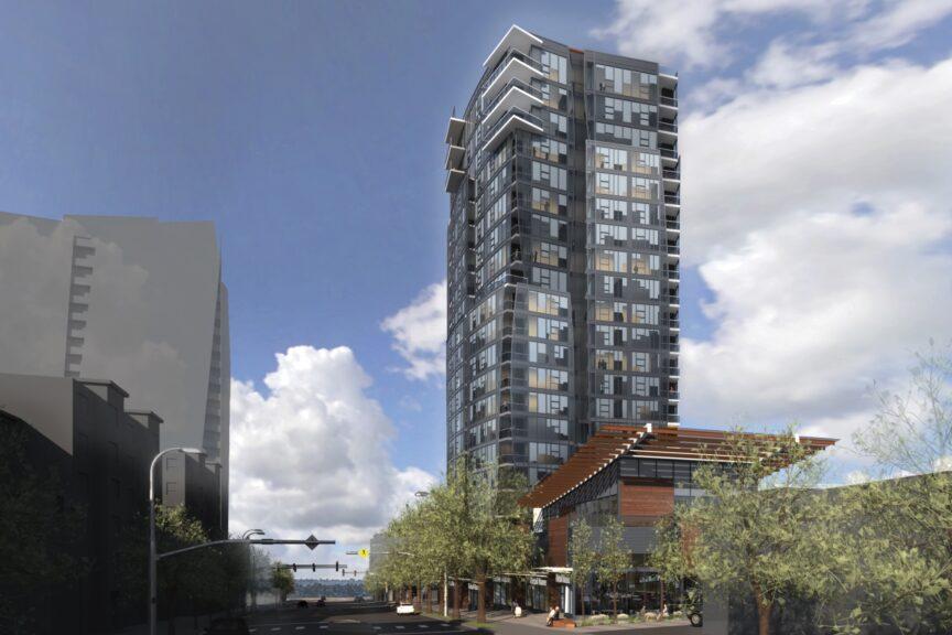 Park Row by Bosa at 215 Bellevue Way NE is Bosa’s latest project in the area. Overlooking Bellevue Downtown Park it will have the best west-facing views of any condo building in downtown Bellevue. Bosa acquired the land in 2019 and looks like it is going to be a 22-story, 143 unit condo with units ranging from one bedrooms to three-bedrooms. There will be two floors of sub-penthouses and two floors of sub-penthouses. Amenities will include concierge, pool and gym. They’re proposing 163 stalls for the condos and 8 guest spots.