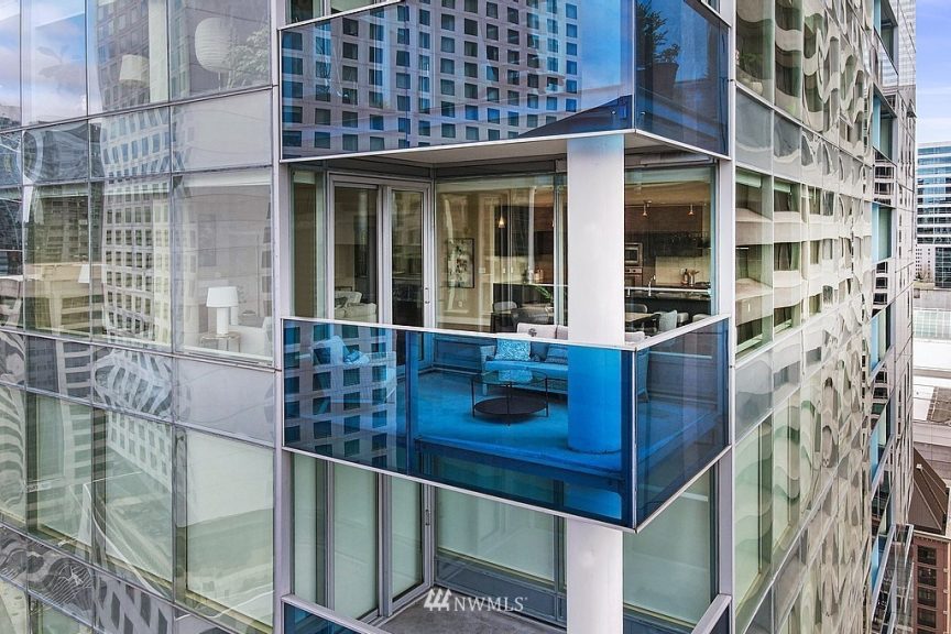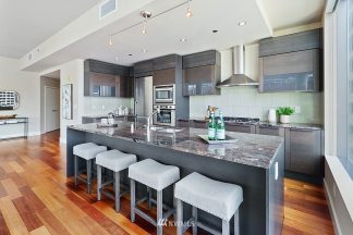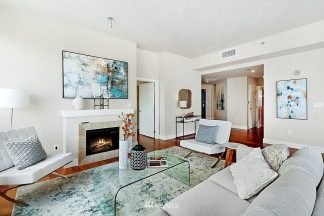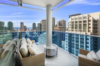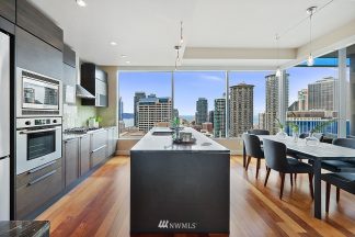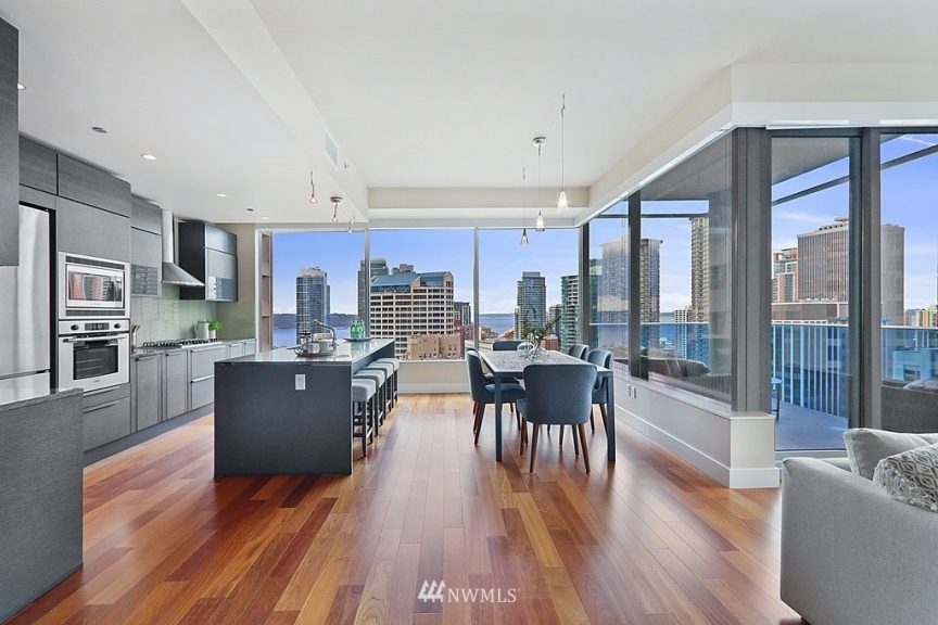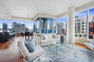 Homes range from spacious one- and two-bedroom residences to three-bedroom penthouses. Interiors feature open-concept floorplans, floor-to-ceiling windows, hardwood floors, and contemporary kitchens with high-end appliances. Many units have private balconies with sweeping views of Puget Sound, Lake Union, the Olympic Mountains, or the downtown skyline.