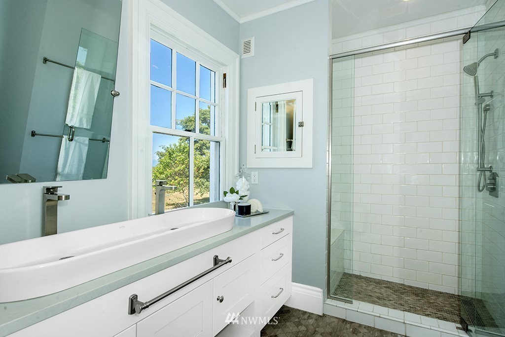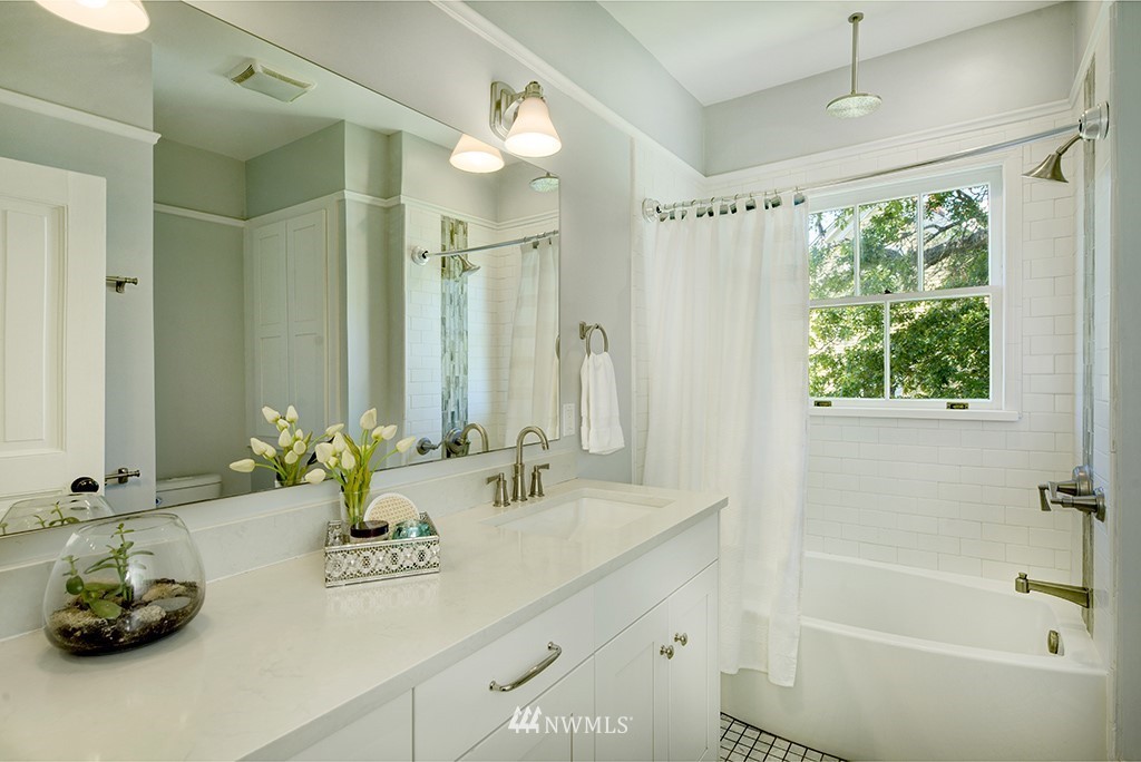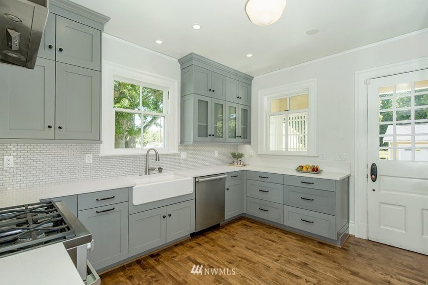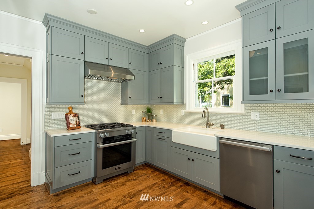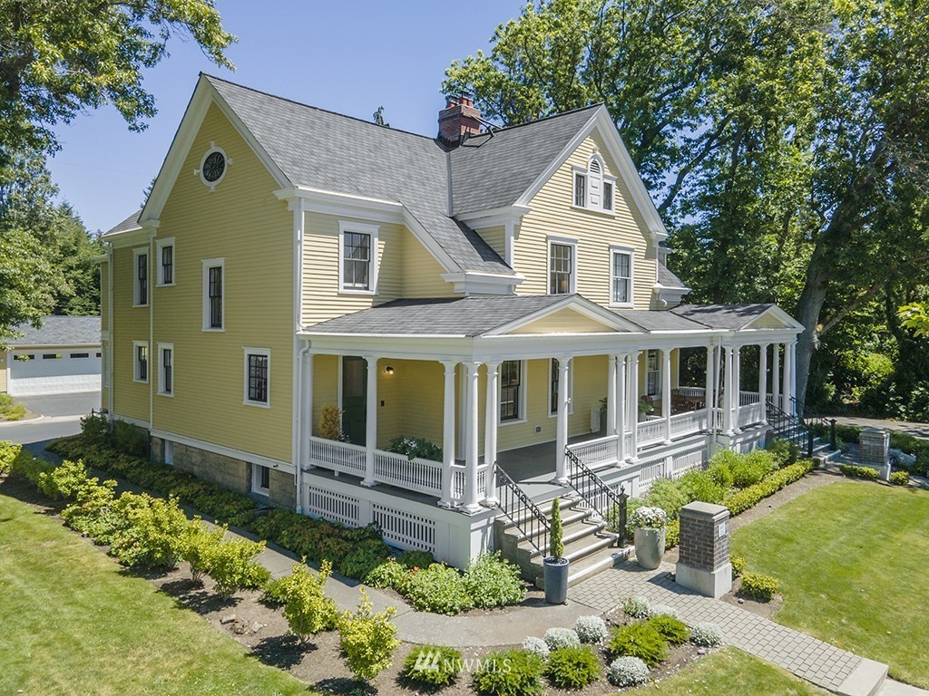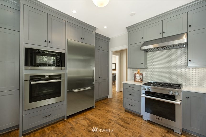 Up a few stairs, the front and side of the home are covered by a sizable wrap around porch—an ideal spot for entertaining or simply enjoying your western view of the park, Elliott Bay and the Olympic Mountains. Inside, the kitchen features custom blue-grey cabinets, quartz counters and Miele appliances—including a gas range. Elsewhere, recent updates include new electrical and plumbing systems, refinished doors, hydronic in-floor heat, a 40-year roof and hardwood floors.
