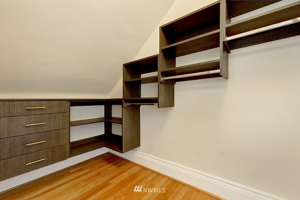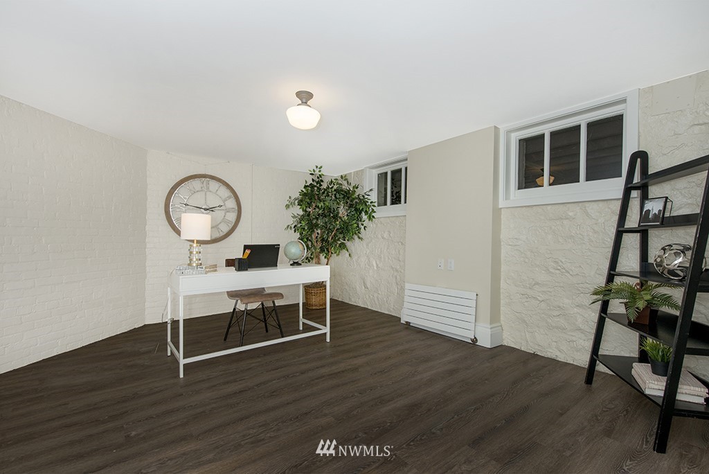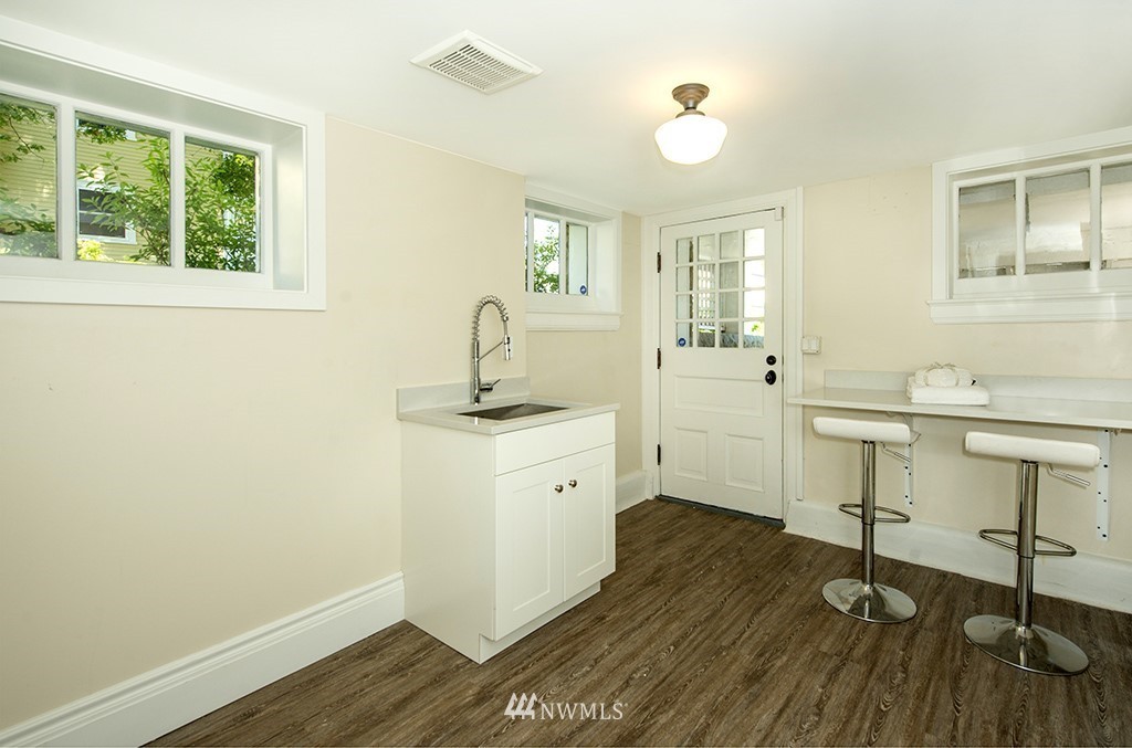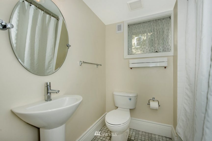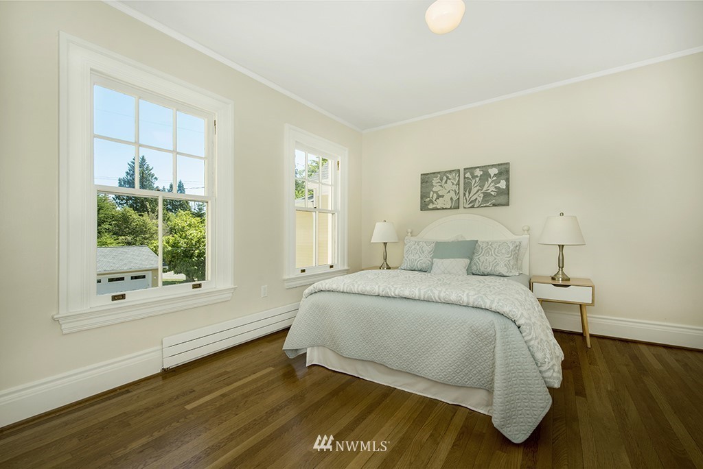 Up a few stairs, the front and side of the home are covered by a sizable wrap around porch—an ideal spot for entertaining or simply enjoying your western view of the park, Elliott Bay and the Olympic Mountains. Inside, the kitchen features custom blue-grey cabinets, quartz counters and Miele appliances—including a gas range. Elsewhere, recent updates include new electrical and plumbing systems, refinished doors, hydronic in-floor heat, a 40-year roof and hardwood floors.