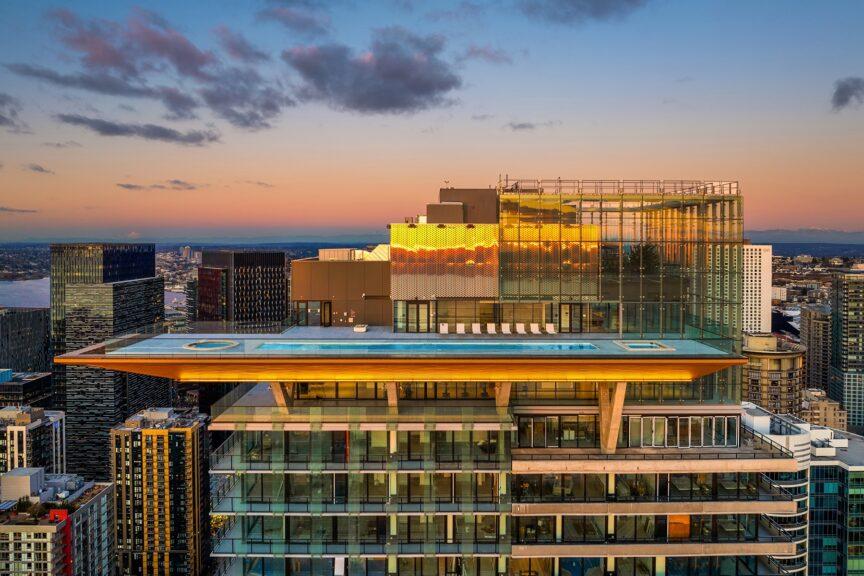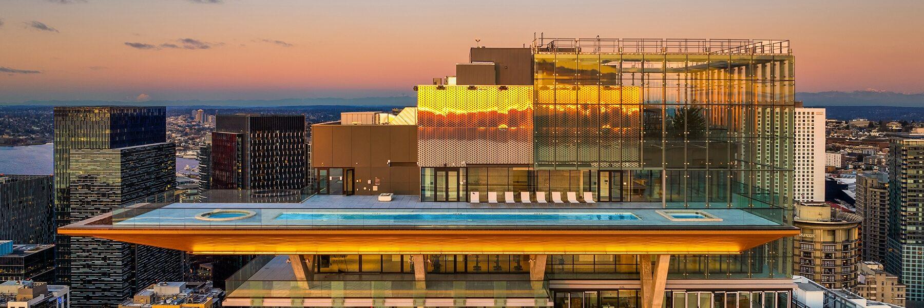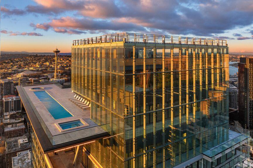 Step into a home that feels more like a gallery in the sky at First Light Seattle, one of the newest buildings in the city. Every detail is a design statement, from the glass art installations by John Hogan to the showstopping rooftop pool that floats above the city.