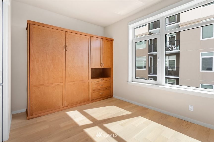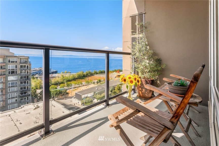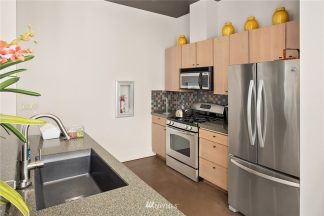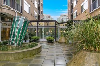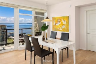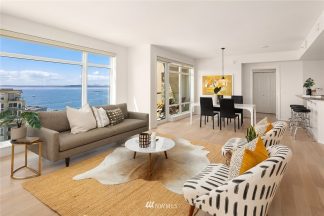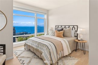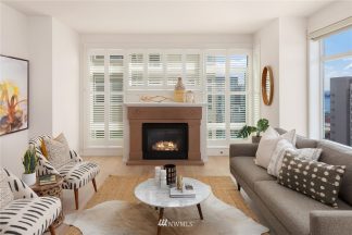 The building is also known for its incredible views. Depending on your unit, you might look out over Elliott Bay and the Olympic Mountains, or enjoy city skyline and Space Needle vistas. Natural light pours into the homes through large windows, creating bright, inviting interiors.